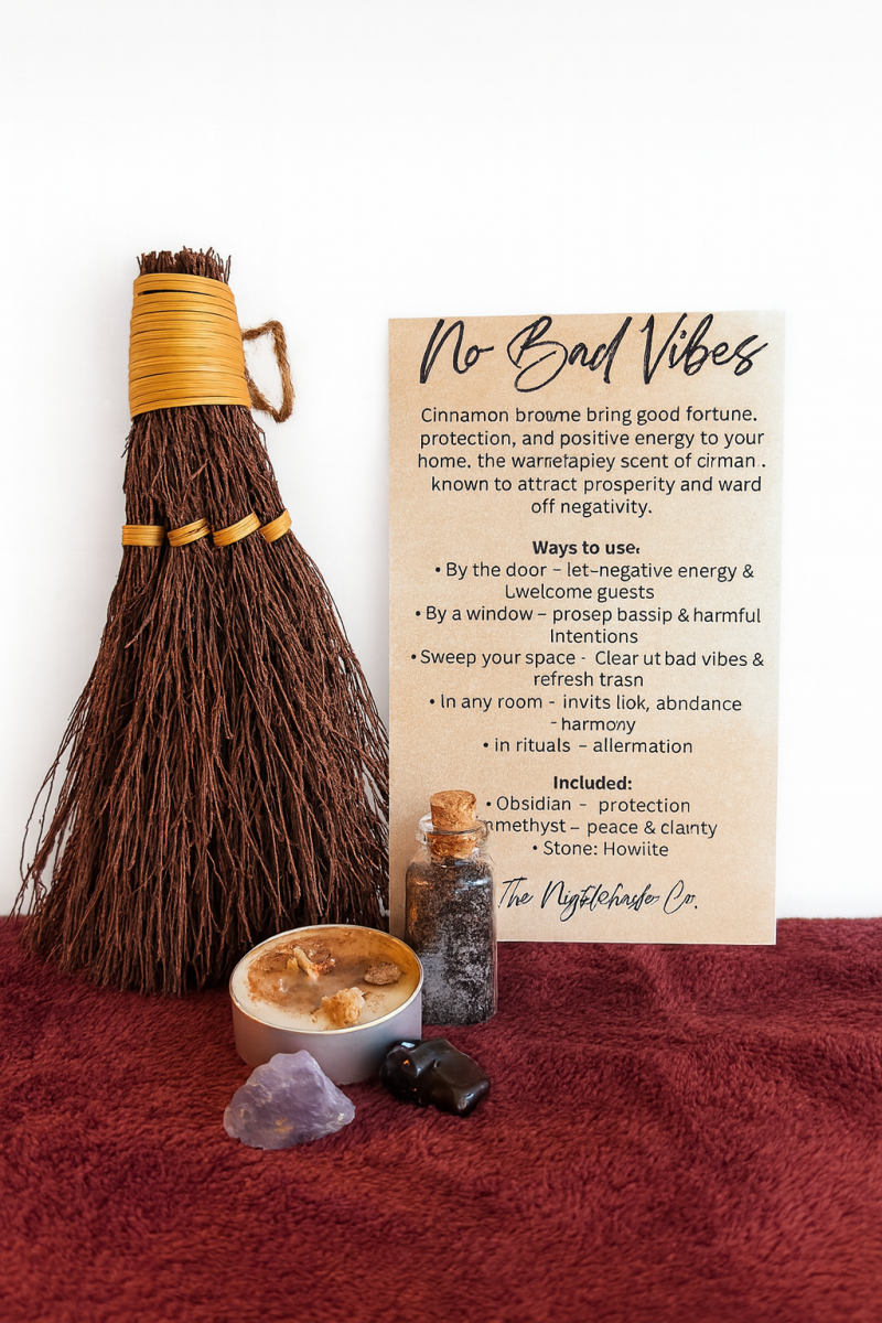 Each set includes a cinnamon broom, obsidian, amethyst, black salt, and a handcrafted candle — all designed to protect, purify, and renew your energy.